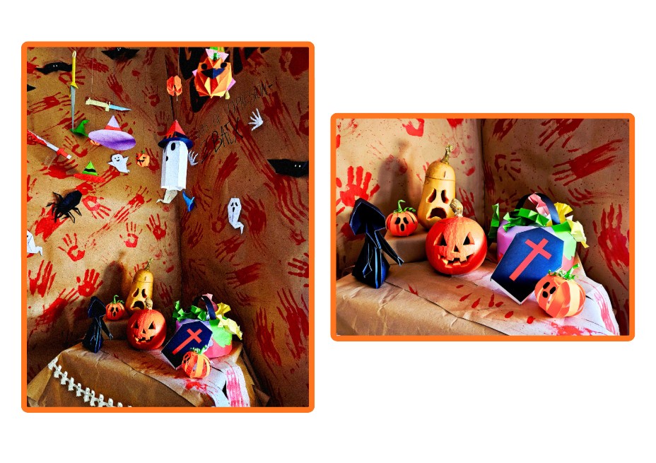 Con imaginación y destreza, han creado un espacio lleno de figuras de papel, calabazas y detalles terroríficos que muestran su creatividad y su dominio de las técnicas plásticas.