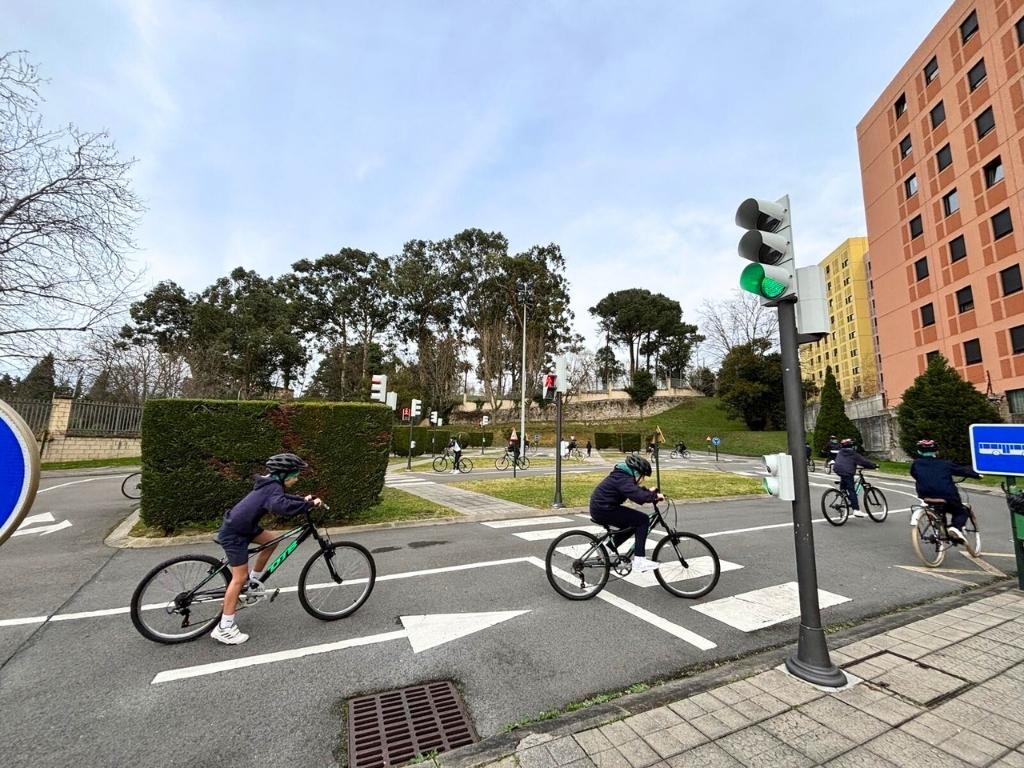 Los alumnos de 5º de primaria han venido a Sarriko a aprender Educación vial, donde dos policías municipales les han enseñado cómo se circula tanto en bici como siendo peatón por la ciudad.