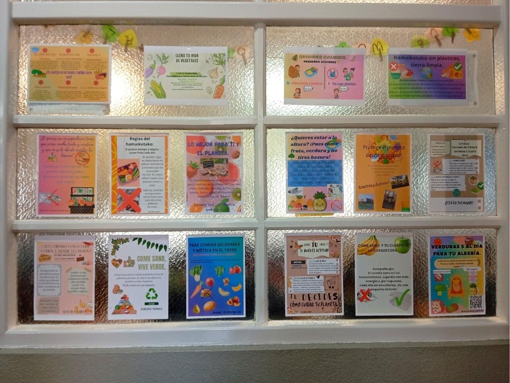 Uniéndolo con las ODS relacionadas con la alimentación saludable y la reducción del uso de envases y plásticos, hemos creado nuestros carteles, para animar a todos los compañeros/as del cole a traer un hamaiketako saludable, en un táper reutilizable.